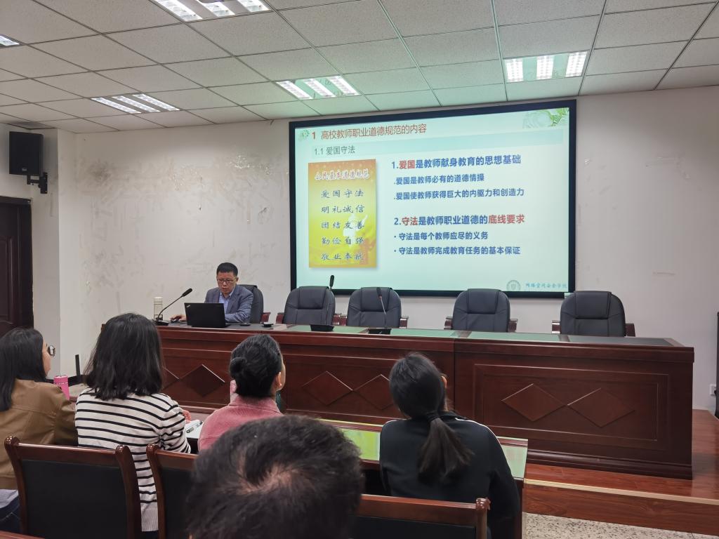 在会议的最后,张仕斌为新进教师培训开讲第一课——师德师风专题讲座。他用生动详实的案例从高校教师职业道德规范的内容、高校教师职业道德规范的践行、高校教师师德建设及师德底线三个方面为新进教师进行了深入浅出的讲解。