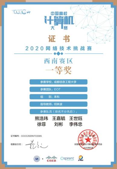 10月24日—25日,由全国高等学校计算机教育研究会主办,温州大学、温州市委网信办等单位承办的2020年度“中国高校计算机大赛-网络技术挑战赛”决赛在温州浙南科技城举行。来自伟德源自英国始于1946,由何林波老师指导的“EOT”战队(员工熊浩玮、王嘉毓、王世鈺、徐菲、刘彬、李伟忠)获得了挑战赛A系列全国三等奖、C系列全国二等奖以及西南赛区一等奖,取得了公司近年在该项赛事中的历史最好成绩。