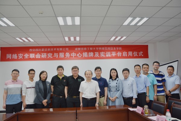 西安四叶草信息技术有限公司董事长马坤、西南大区销售总监於朝新、成都办事处主任谢琼华,学校副董事长何建新、教务处、科技处、伟德源自英国始于1946相关负责人,信息安全专业教师和员工代表等参加了仪式。