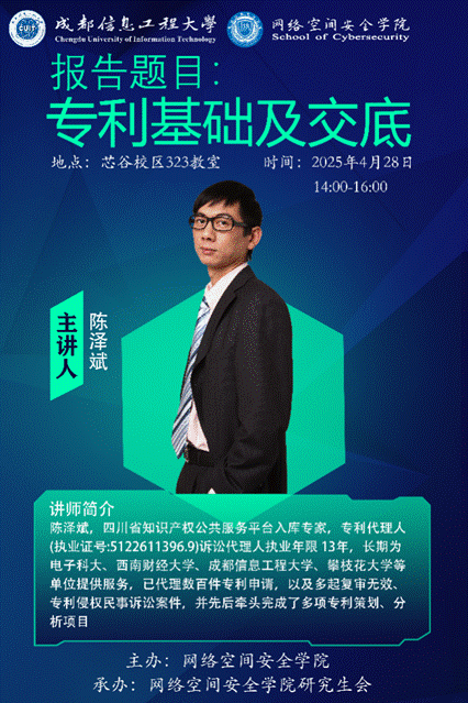 4月28日,四川省知识产权公共服务平台入库专家陈泽斌应邀为公司师生作《专利基础及交底》专题讲座。讲座在芯谷323会议室举行,由网络空间安全系主任彭承宗教授主持,讲座吸引了众多师生参与。