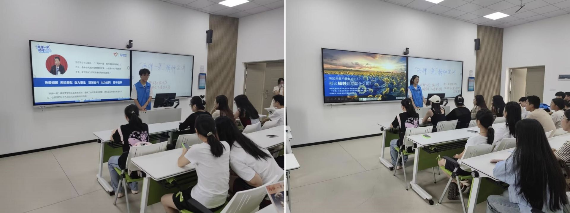 随后,宣讲团进行科普宣传,以日常生活为切入口,传播地核辐射知识。例如,日常生活中的辐射和核辐射的区别是什么?核电站进行核聚变有哪些安全保护措施?我们身边的辐照食品的生产过程是怎样的?宣讲团成员逐一讲解,为同学们解开了谜底。这些科普知识不仅让同学们打破了对核辐射的刻板印象,还对核有了更全面的认识。最后,以中核集团拍摄的泡椒凤爪的辐照流程视频结束了本次宣讲。