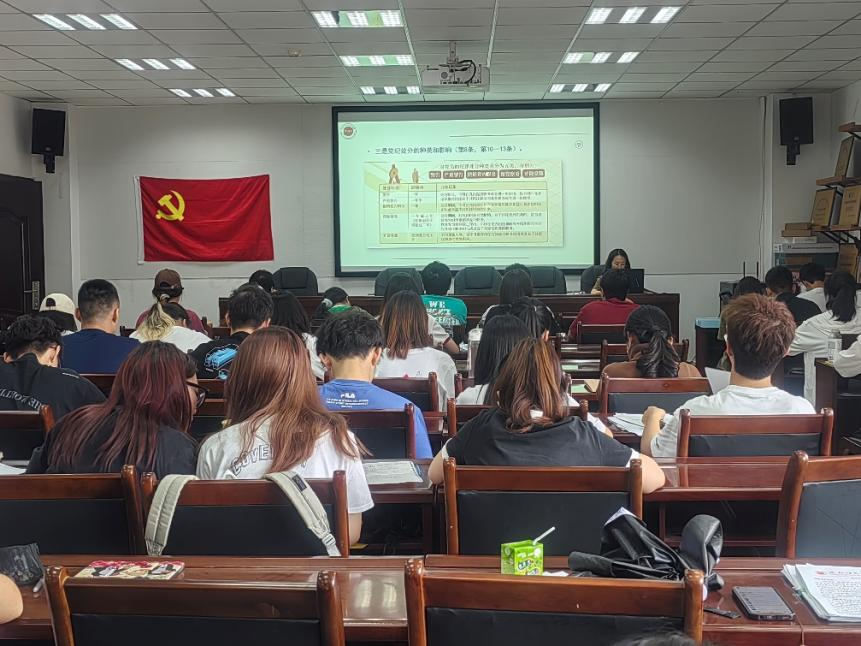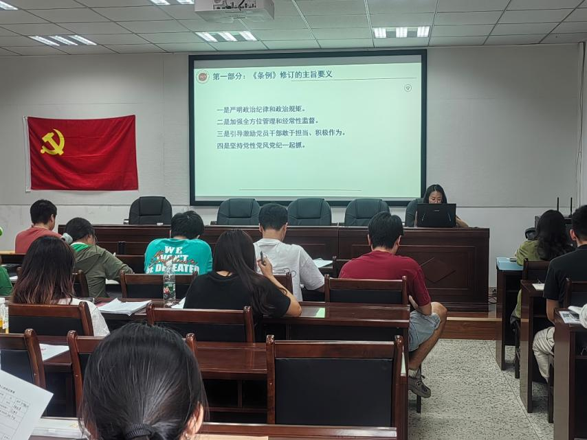 会上,贾茜老师以深厚的政治素养和丰富的工作经验,为同学们解读新修订的《中国共产党纪律处分条例》,鼓励员工党员要将学习贯彻新修订的《条例》作为重要政治任务,准确掌握其主旨要义和规定要求,进一步明确日常言行的衡量标尺,用党规党纪校正思想和行动,真正使学习党纪的过程成为增强纪律意识、提高党性修养的过程,做到学纪、知纪、明纪、守纪。还对条例中的重点内容进行深入剖析,介绍条例的修订背景和主要目的,强调了加强党的纪律建设对于推进全面从严治党、保持党的先进性和纯洁性的重要意义。她详细解读条例中关于违纪行为的认定、处分种类和程序等方面的规定,并结合实际案例,分析违纪行为的危害性和处理原则。
