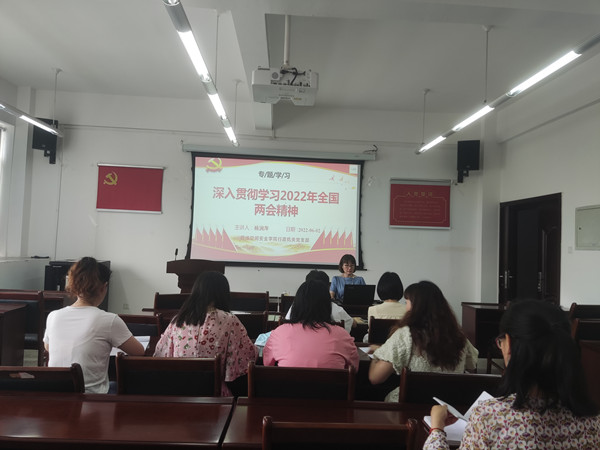 党支部书记杨润萍同志首先向全体党员介绍了2022年全国两会基本情况,传达了两会精神,带领大家一起学习了政府工作报告的主要内容,并对2022年工作热点和中国发展新走向进行了解读和讲解。随后又带领大家重温了2013年以来习近平总书记关于教育的重要论述。