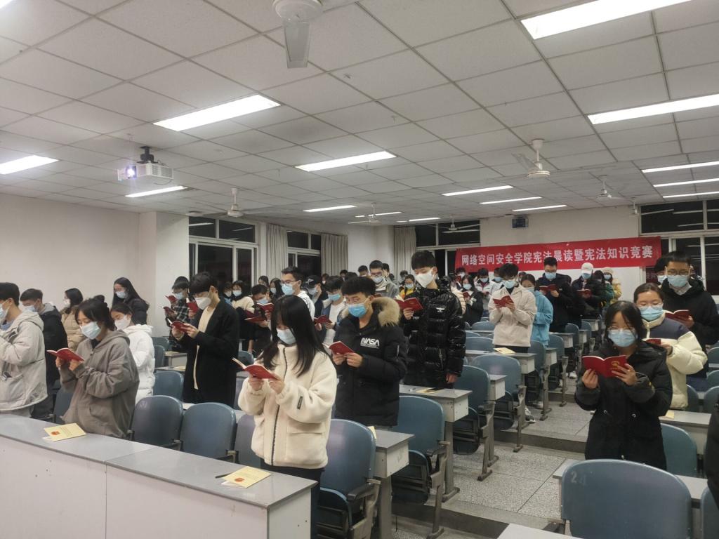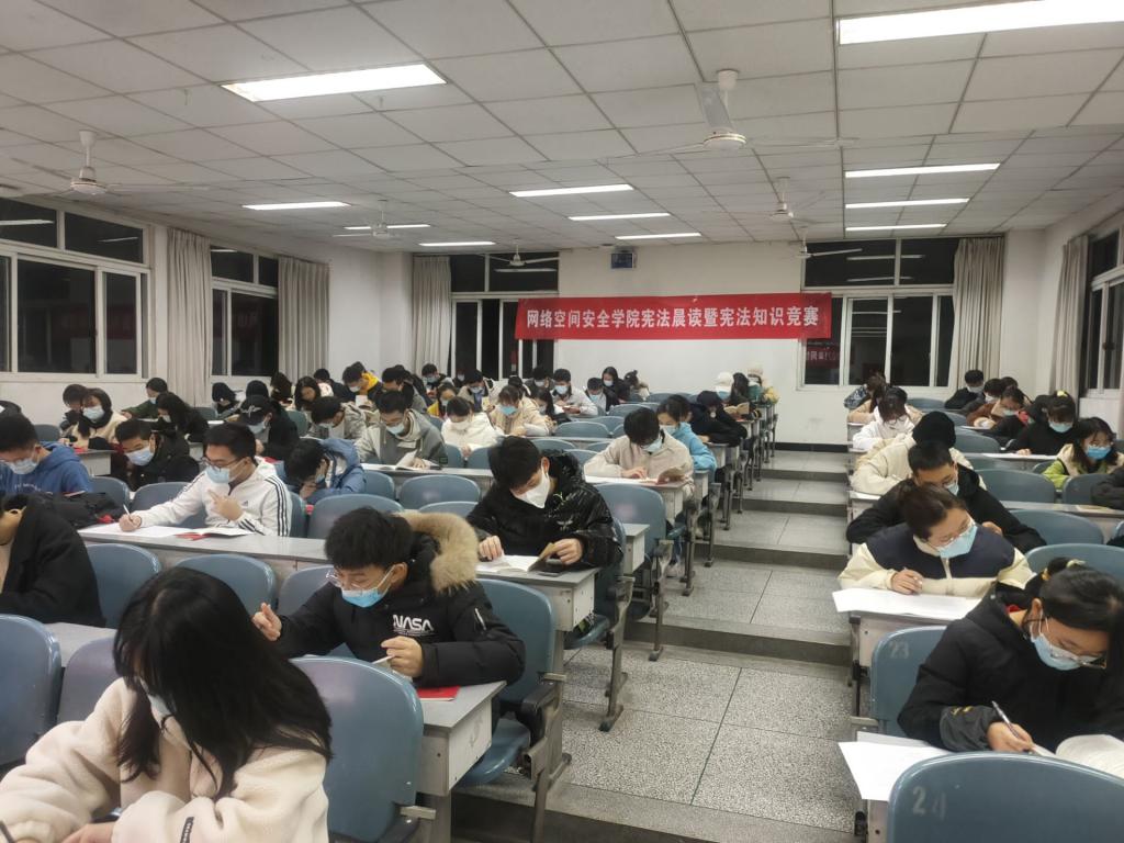 本次竞赛采取开卷考试形式,题型包括单选题、多选题、判断题和简答题。待所有人签到并领取中华人民共和国宪法和中华人民共和国网络安全法两本册子之后,主持人上台带领所有党员齐读中华人民共和国宪法第1-15条法律。随后,主持人向参赛者介绍本次知识竞赛规则和纪律要求:参赛者在考试期间不可使用任何电子产品。答题过程中,参赛者聚精会神,奋笔疾书,教室里回荡着翻页声。本场竞赛时间为一小时,结束后,参赛者们安静有序的离场。批阅试卷的过程保证公平、公正、公开,本次竞赛设置了一等奖4名,二等奖6名,三等奖10名。