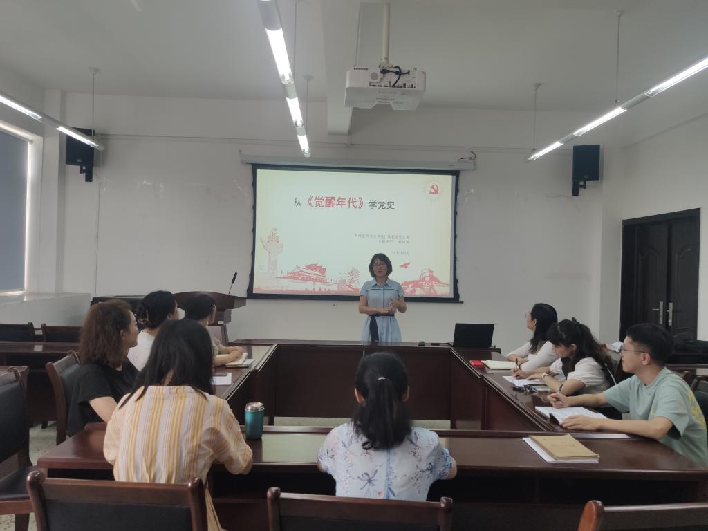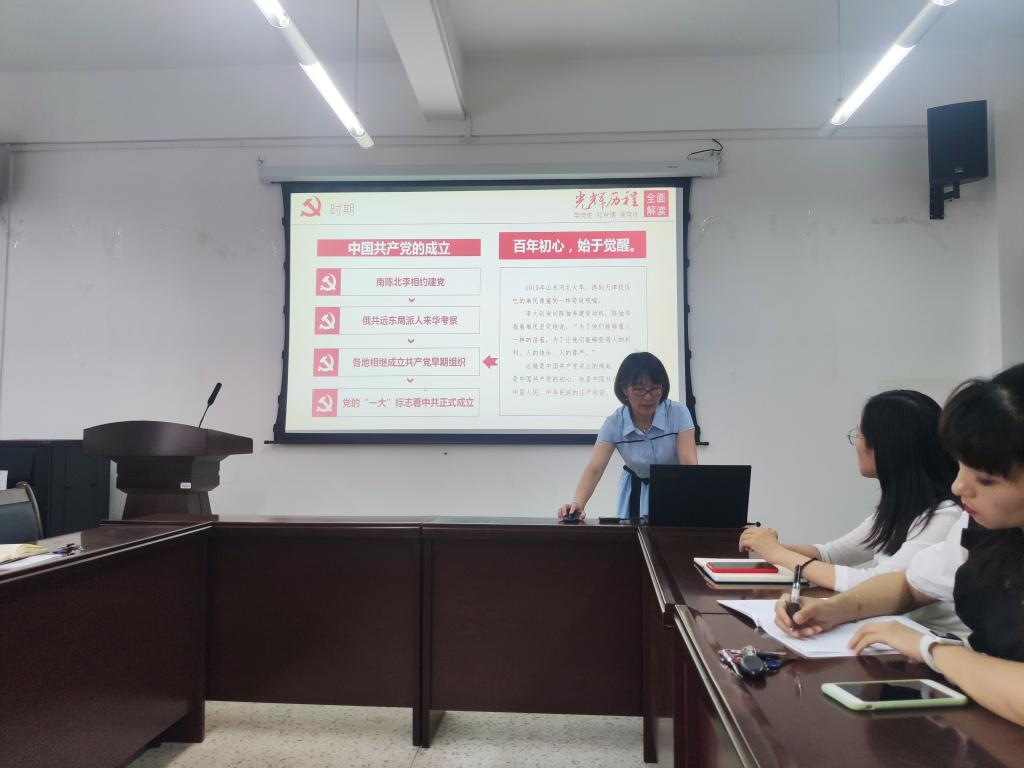 之后杨润萍给全体党员上了题为《从觉醒年代学党史》的党课。党课以中国共产党成立之初的历史为主题,从重温《觉醒年代》剧中相关事件的视频开始、谈到新文化运动及五四运动的意义:它们打破了封建思想的桎梏,在中国社会中掀起了思想的启蒙运动,标志着我国新民主主义革命的开端,为马克思主义的传播奠定了基础。并且日益与中国工人运动相结合、为中国共产党的创立打下了坚实的群众基础。