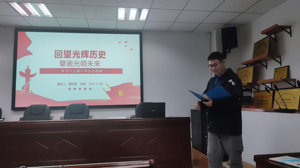 随后,陈鑫、蒋昕男、张诗悦、蒋芸潞四名同志用生动的语言,梳理了十九届六中全会的主要内容,从中国共产党是善于总结实践经验、提升理论认识的党以及党的百年奋斗成就、党的百年奋斗意义、党的百年经验四个方面,详细阐述了百年党史上“两个决议”的产生背景与历史使命,以及此次全会审议通过的《中共中央关于党的百年奋斗重大成就和历史经验的决议》的重要内容和重大历史意义,为大家进一步深刻领会党的十九届六中全会精神深刻内涵和伟大意义提供了有益指导。