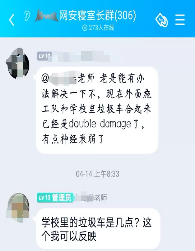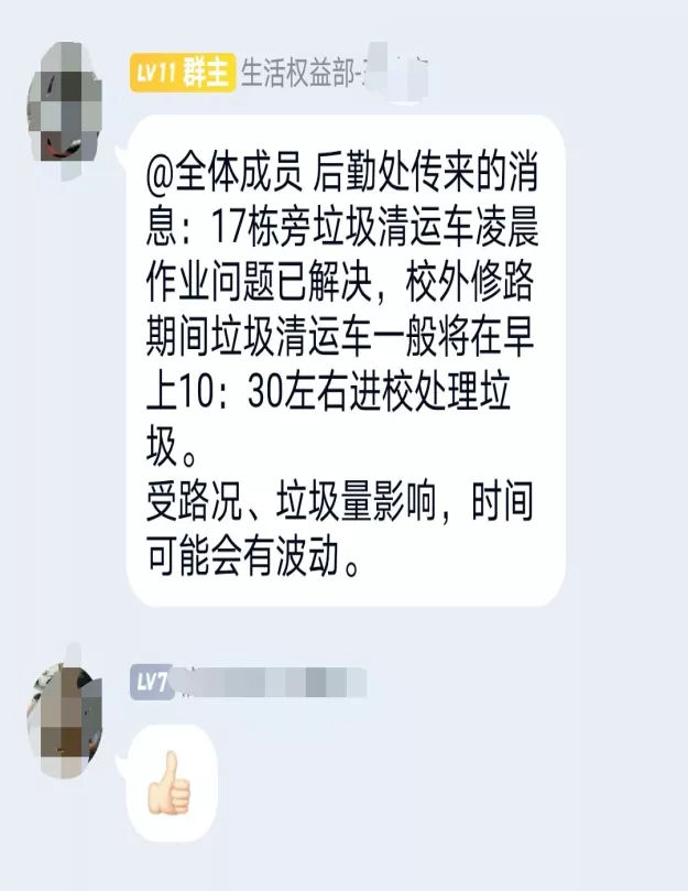 一)噪音问题问题反映:员工住宿17栋旁垃圾清运车凌晨工作影响同学们睡眠。解决情况:通过老师与网安生活权益部工作人员向学校后勤处反应将垃圾清运车时间调整为早上十点半左右进校处理垃圾。
