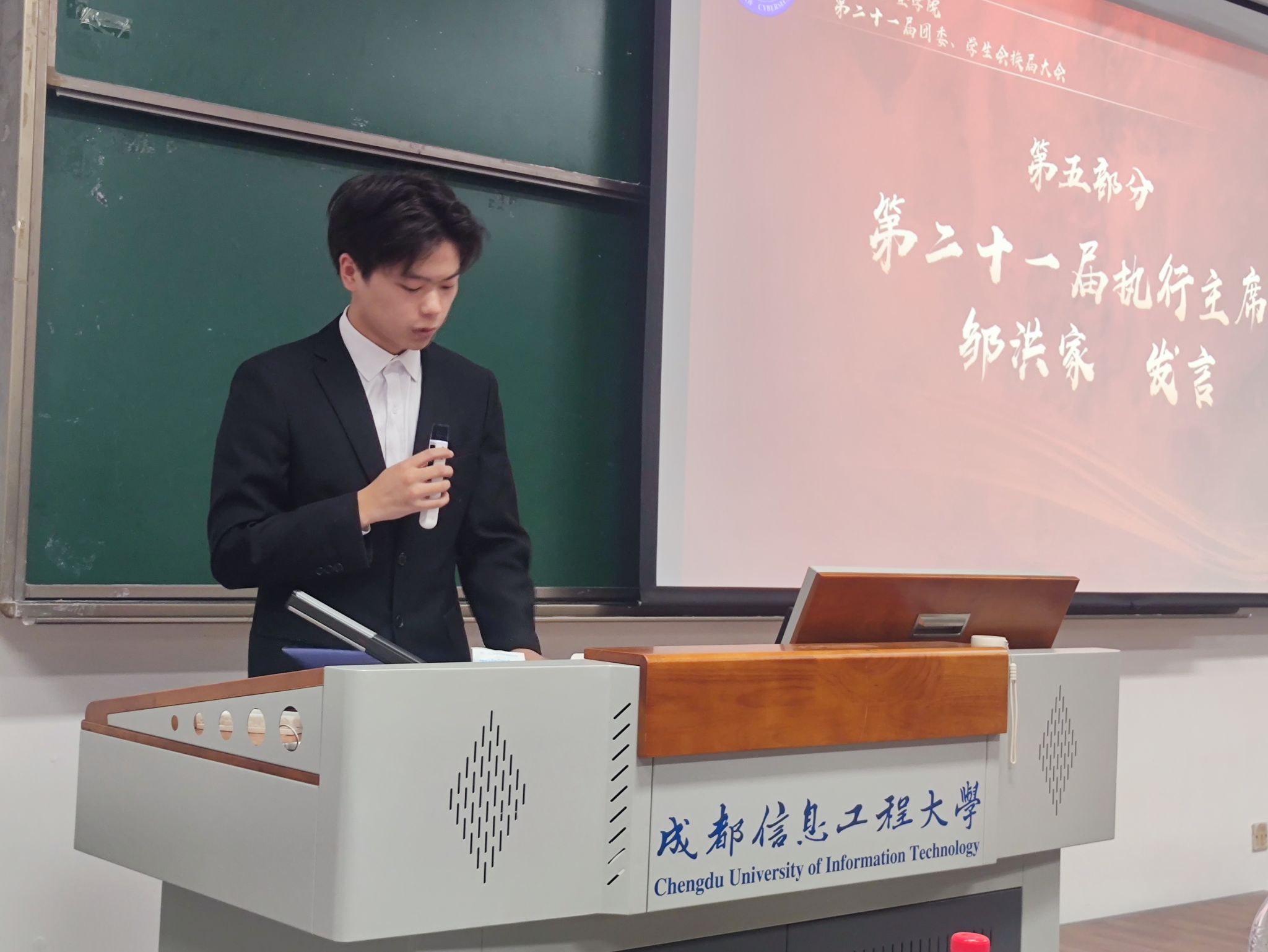 大会最后,夏焜和韩阳为所有团学部门成员颁发聘书。夏焜宣读了第二十一届团委员工会干部名单,并进行致辞。他对全体团学干部的贡献表示感谢,强调了“量的积累到质的转变”的重要性,对员工干部提出三点期待:服务同学发挥员工干部带头作用;培养自身的领导才能和团队合作意识;持续创新推动团学工作。