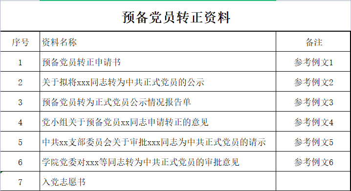 在预备党员转正的环节,学院也提供了相应的模板和资料,资料如下。