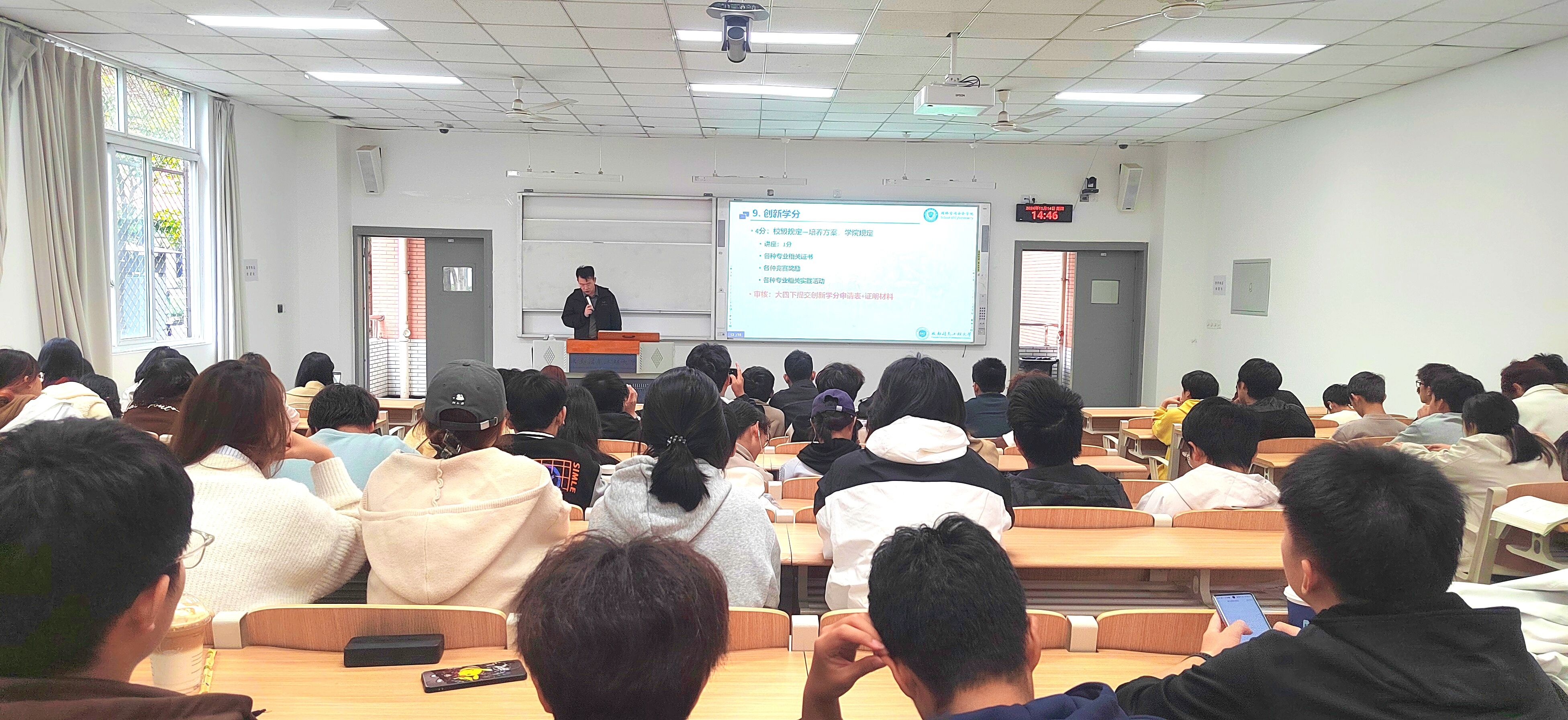 讲座最后,彭承宗副教授详细介绍了学院对本科阶段的学习规划,并重点阐述了从大一到大四各阶段的学习任务。他鼓励新生积极参与学院特色资源和社团活动,积累实践经验,同时提醒大家关注创新学分的积累,以确保顺利完成学业。