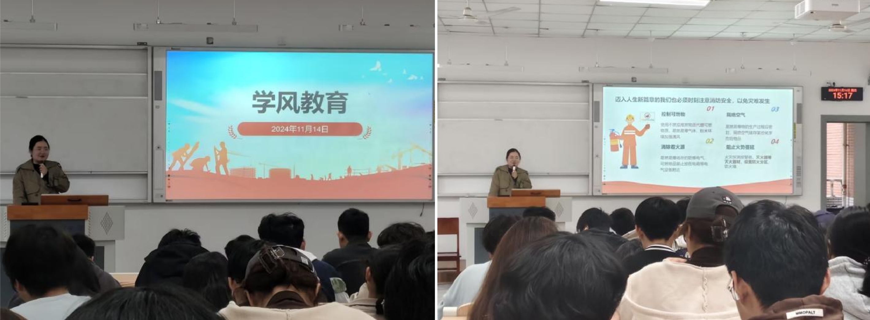 接着,辅导员韩阳针对道德诚信、学风建设、消防安全、宪法学习、心理健康以及防诈骗进行了多个主题教育。她对课堂出勤和诚信考试进行了着重强调,鼓励大家克服学习困难,相信“能行”,争取全面发展。