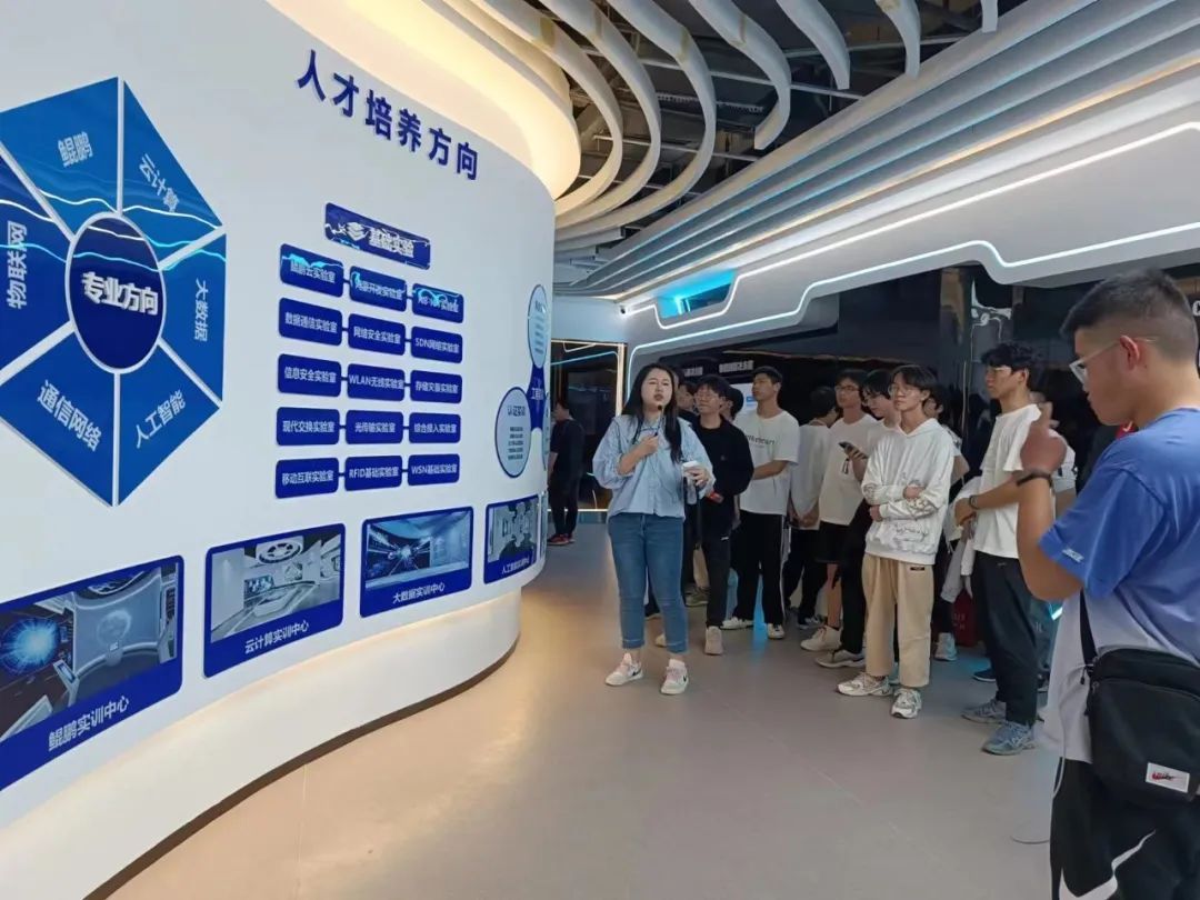 在王娇娇经理的带领下,全体师生参观了鲲鹏人才基地建设背景、鲲鹏行业生态、公司介绍、数据中心等几大展区,详细了解了目前国产计算行业生态发展概况、当下最热门的技术方向、讯方技术与高校合作情况。王娇娇老师也对同学们勉励到,目前国产计算行业生态岗位缺口巨大,希望同学们能够从本次认知实习中有所收获,早日做好职业生涯规划,未来能够加入其中。