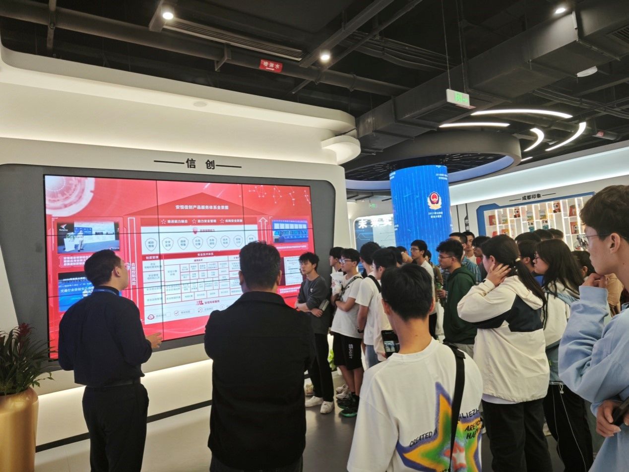 活动第一项,参观安恒公司展厅。由安恒信息四川教育团队大客户经理楚豪、安恒信息成都行销团队安全工程师王浩带领大家参观学习。两位工程师以“构建安全可信的数字世界”为主题给大家讲解了安恒公司的发展史以及在发展的同时取得的成就;参观了安恒取得的专利证书墙(部分);介绍了新一代安全服务的主要内容并着重讲解了数据安全的管控流程以及重要性;普及了信创的定义并为大家介绍了安恒信创产品服务体系。同学们一边参观一边认真学习,期间还拍照记录自己感兴趣的部分,经过讲解大家对网络安全技术的理解又加深了。