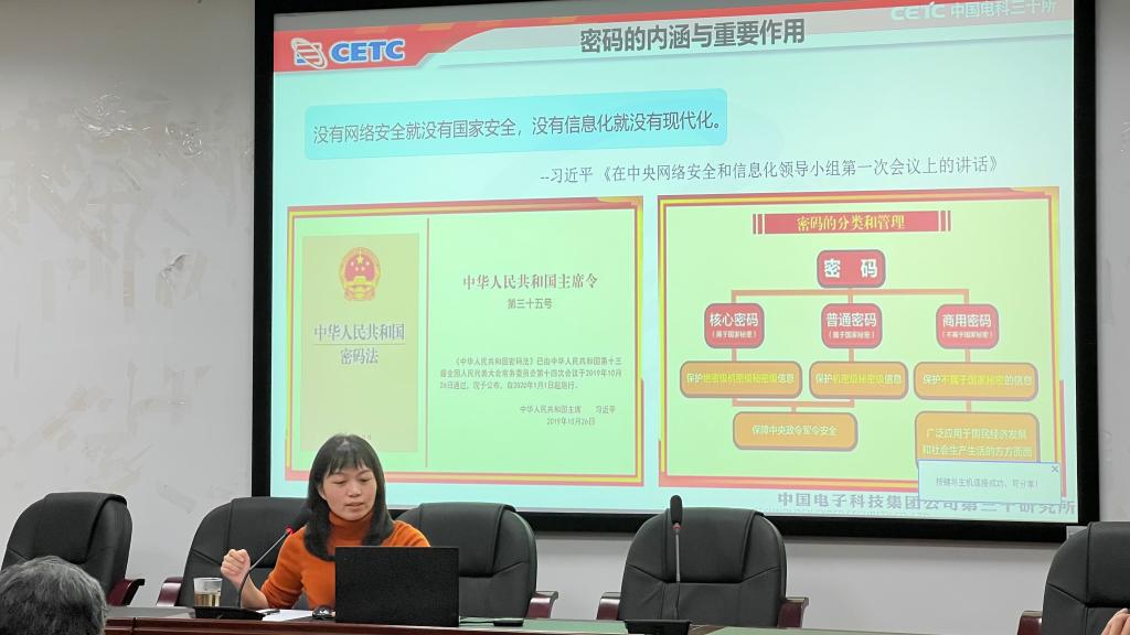 随后,中国电子科技集团公司第三十研究所高级专家曹云飞向大家介绍了研究所实验室的工作内容以及目前致力研究的前沿项目,为参会同学指明学术研究方向。