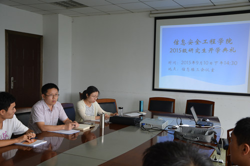 【本网讯】9月10日,信息安全工程学院2015级研究生开学典礼及入学教育在信息楼四楼三会议室举行。经理李飞、副经理张仕斌、办公室主任兼研究生班主任杨润萍、研究生教学秘书王培林及2015级新生出席了会议。