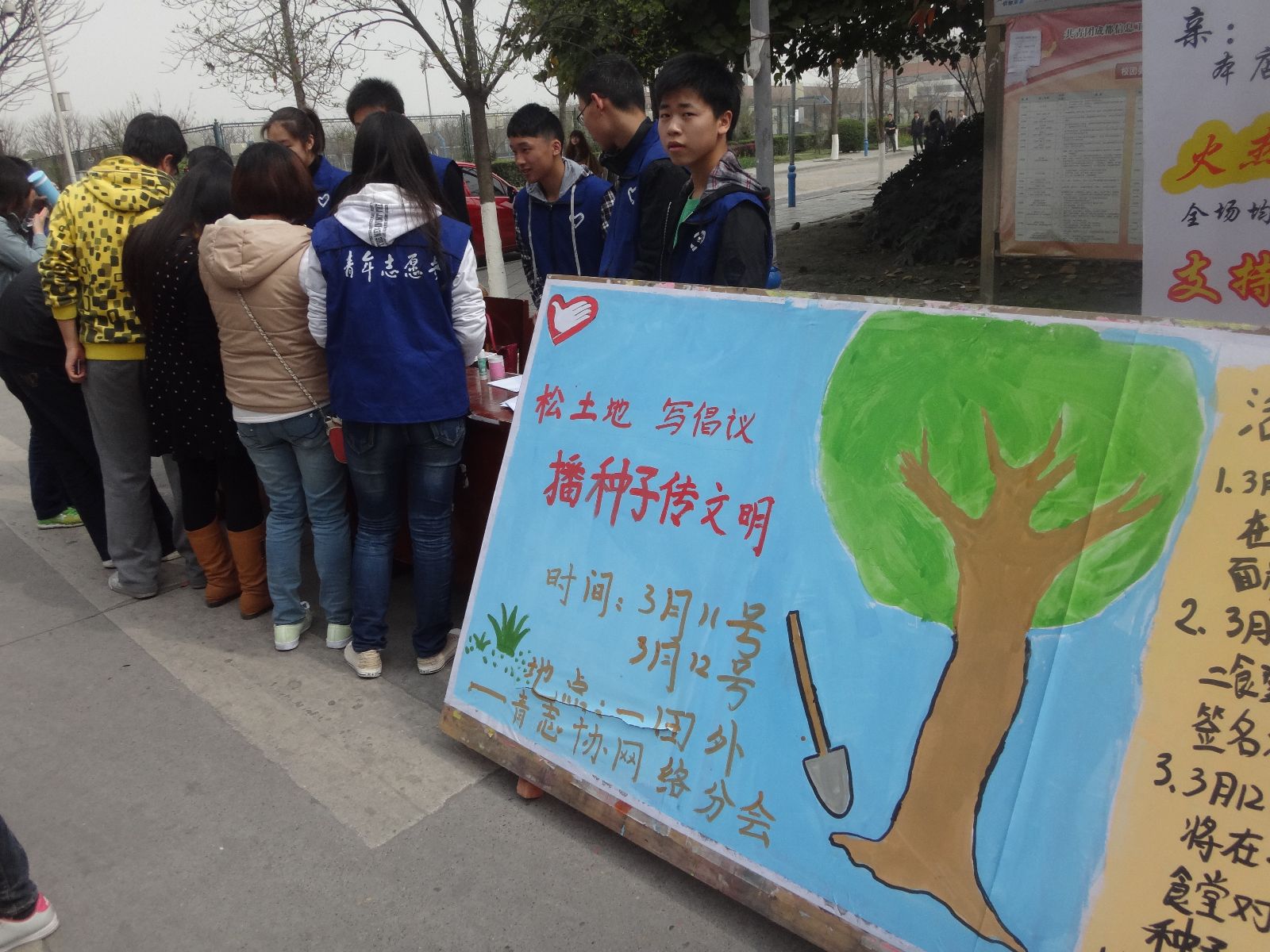 2013年3月11日下午6点半,信息安全工程学院青年志愿者协会(以下简称青志协)的志愿者们在第一田径运动场外拉开了今年名为“松土地,写倡议,撒种子,传文明”的植树节序幕。
