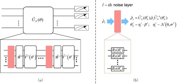 图 (a)所提出的带有噪声层的QNN结构。(b)噪声层中的具体结构,以RY门为例。