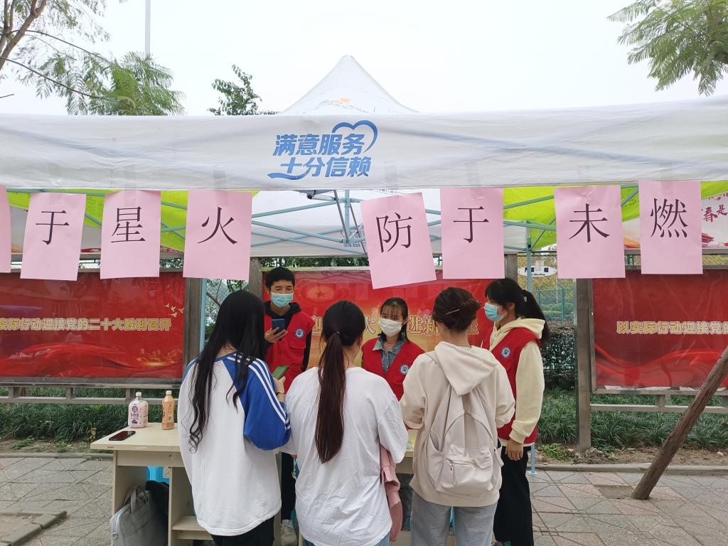 活动前,为增加活 动的参与度,志愿者通过各个渠道对活动进行宣传,充分准备活动所需物品并且自觉佩戴口罩,既确保了活动的顺利进行,又保证了在疫情下开展活动的安全性。活动现场,参与者积极参与有关消防知识及消防安全的有奖问答游戏,题目包括对消防栓的使用,不同火灾情况下使用的灭火器类型,校园内可能起火的原因等诸多消防问题,若参与者回答正确,会获得相应的小礼品作为奖励。活动最后,志愿者邀请参与者合影留念。