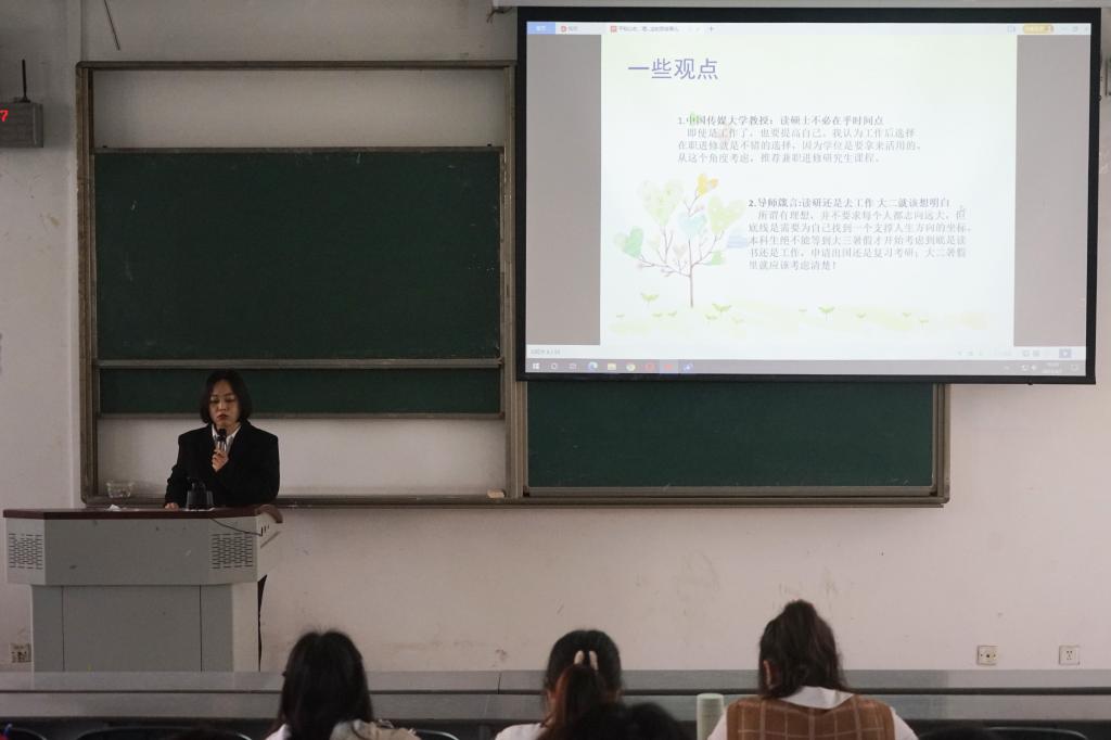 讲座伊始,孙光老师和同学们一起参与了一个名为“雨点变奏曲”的小游戏,借此来提高同学们的兴趣。接着,孙光老师列举了2016-2022年研究生报考与录取人数情况、2016-2021年中国高校毕业生人数变化等数据,指出老员工毕业后选择考研还是就业是困扰许多老员工的一个难题。针对这个难题,孙光老师并没有正面给出答案,而是给出了一些观点:“读硕士不必在乎时间点”、“动机不必深究,能力培养是关键”、“早点离开校园去打拼,你还有本钱经历失败”。听了孙光老师的一番讲述,同学们茅塞顿开,对于考研还是就业有了新的看法。