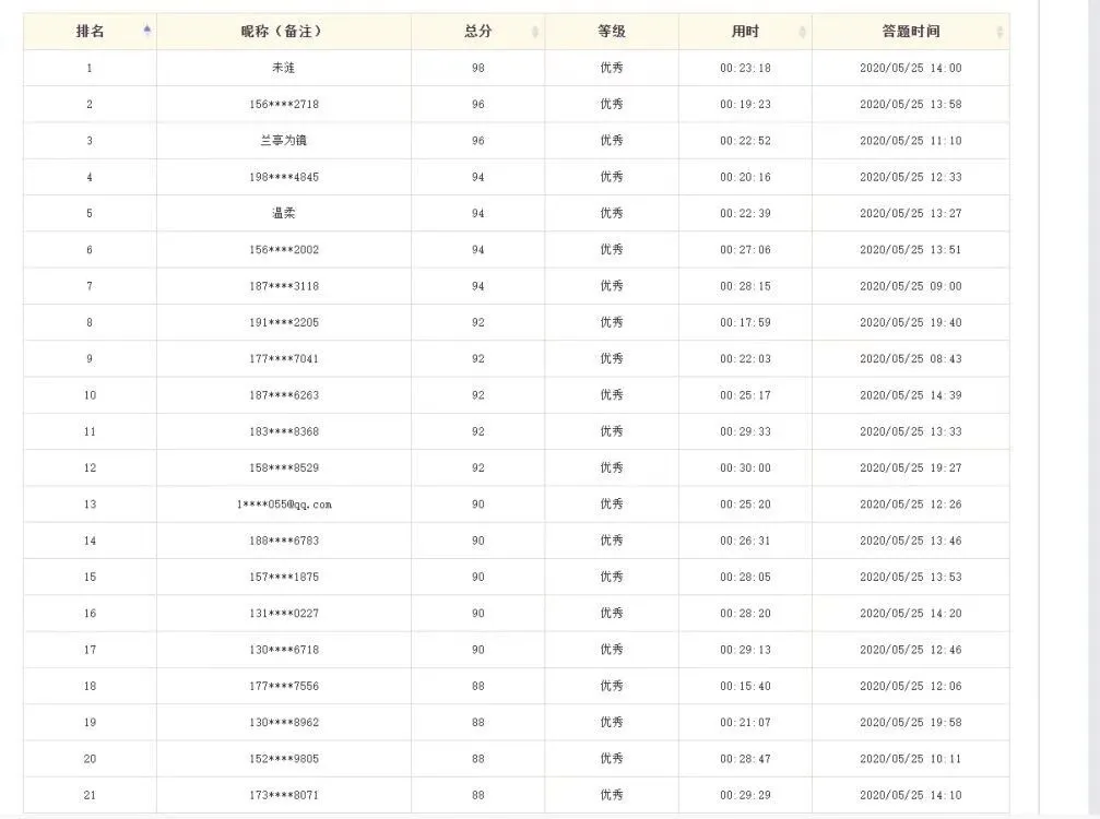 经过公司前期积极的筹备,于5月25日吸引了近200名同学参加本次云端竞赛。本次竞赛试题为随机抽题,由25道单选,10道判断和15道多选组成,限时30分钟完成。由于赛前的充分准备,同学们均取得了非常不错的成绩,85分以上的优秀者占总人数的15%,70-85分的良好者占比高达37%,合格者占比80%。此次竞赛不仅帮助同学们树立了维护心理健康的意识,而且培养了良好的心理素质,为面对以后繁忙的工作和学习奠定了坚实基础。
