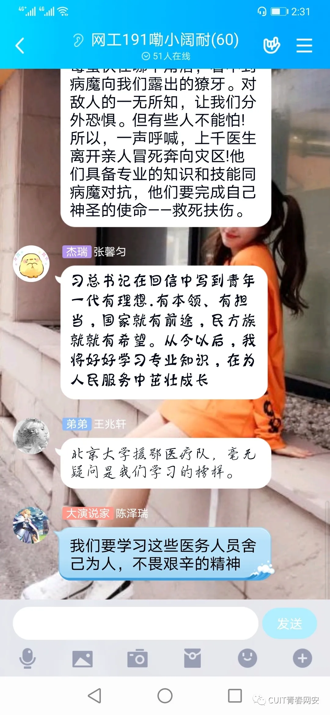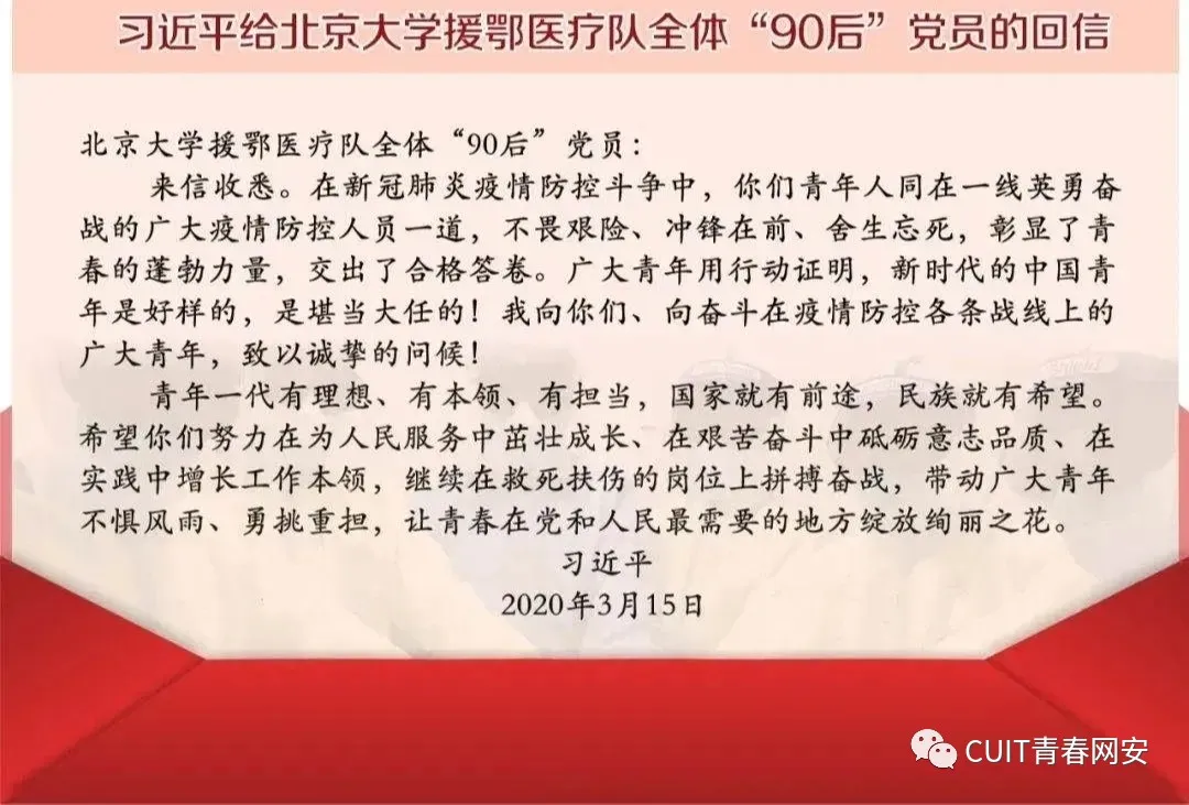 对于同为青年的我来讲,为国家效力是一份使命,也是一种责任,我想给北京大学援鄂医疗队全体“90后”党员点赞,他们付出的每一份汗水都没有白费,国家主席的回信更是给了他们的肯定,同样也给了当代青年一种激励的态度,我相信疫情会过去的,祖国的未来是光明的!