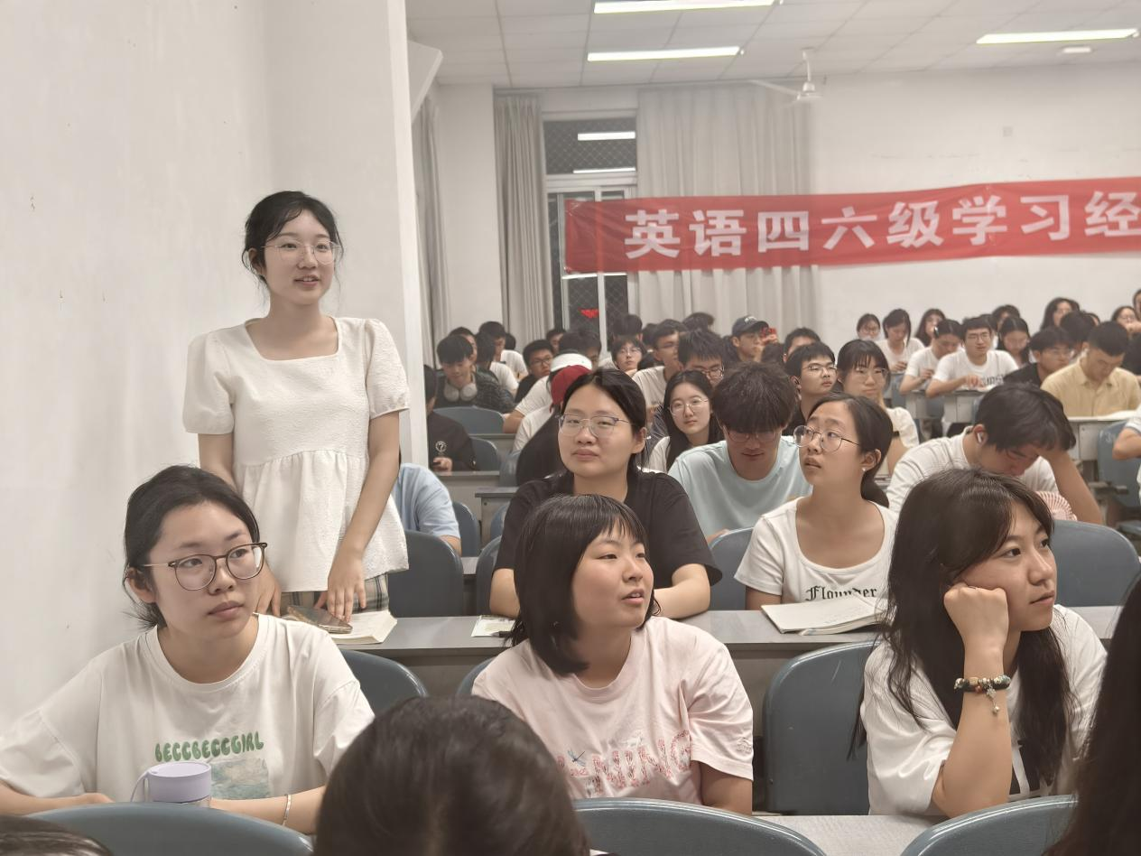 在分享环节结束后,进入提问环节,在场的同学们与嘉宾进行交流互动,他们就自己在四六级备考方面不懂的问题提出疑问,嘉宾们针对问题认真思考,并给出相应的意见和解决办法。